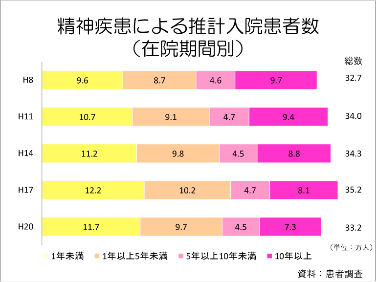 精神疾患を理由に入院している患者の中には、下のグラフのように、入院が長期間に渡っている方々が多くいらっしゃいます。この中には、住まいの場や地域での支援体制等が整えば退院できる精神障害者の方も多いとされています。