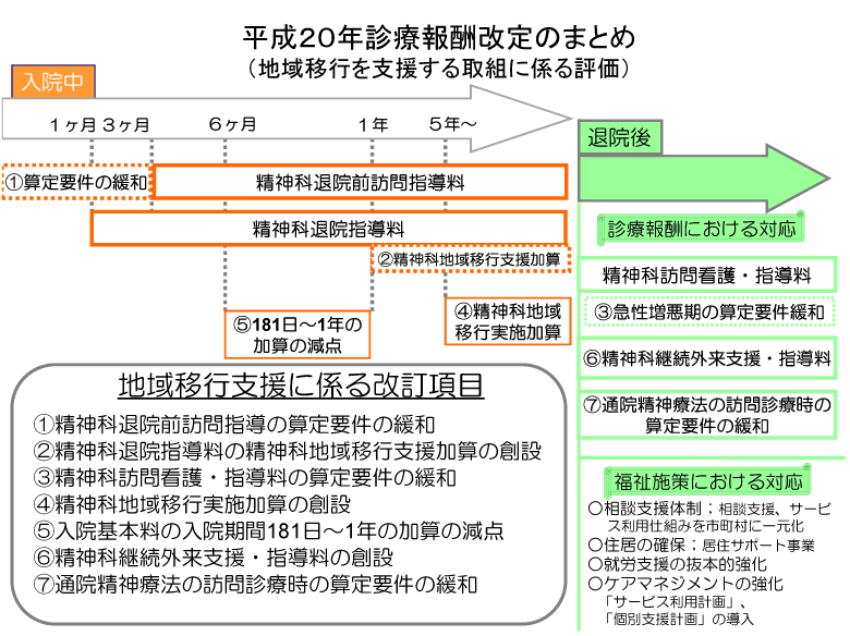 入院する精神障害者の方々の地域移行を進めるに当たっては、地域での福祉サービスの拡充等の支援に加え、入院する病院において、早期の退院に向けた取組みや、退院後の地域生活を支える医療的支援の取組みが行われることが不可欠であり、平成20年の診療報酬改定では、病院による取組みを促進する観点から、様々な項目にわたって充実を図りました。