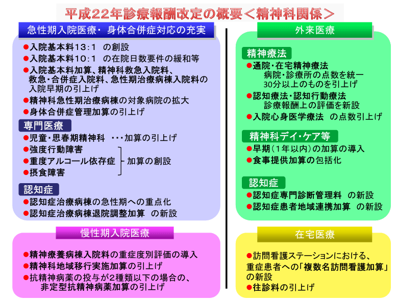 更に、平成22年度の診療報酬改定においても、精神科地域移行実施加算の引き上げ、重症者への訪問看護の充実など、精神障害者の地域移行の促進や、地域生活の支援の観点から充実を図っています。