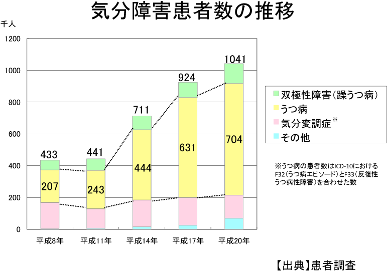 厚生労働省が3年ごとに全国の医療施設に対して行っている「患者調査」によると、平成8年には43.3万人だったうつ病等の気分障害の総患者数は、平成20年には104.1万人と9年間で2.4倍に増加しました。「患者調査」は、医療機関にかかっている患者数の統計データですが、うつ病患者の医療機関への受診率は低いことがわかっており、実際にはこれより多くのの患者がいることが推測されます。