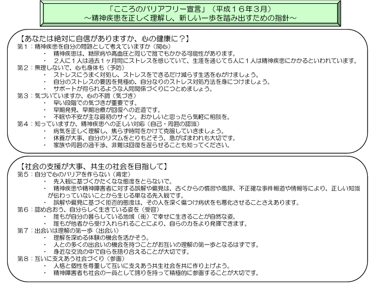 ●平成15年~16年に開催された「心の健康問題の正しい理解のための普及啓発検討会」では、精神疾患等に対する正しい理解の普及・啓発について検討され、精神疾患等を正しく理解し、行動するための指針である 「こころのバリアフリー宣言」をとりまとめ、これに基づき、普及啓発の取組を実施しました。